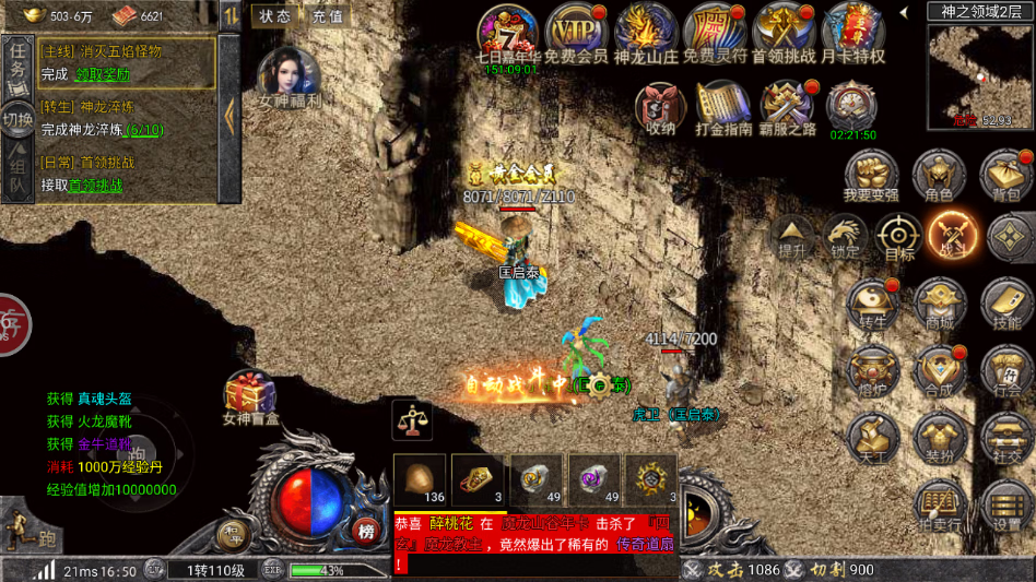 《龙战八荒》不仅仅只有等级转生地图,我们还增加了 封号地图-神殿: 盟重NPC-封号神殿处到达指定封号等级之后消耗神殿卷轴即可进入,封号地图更容易获得GM系列装备,功勋令 元婴地图-万恶之源: 盟重NPC-万恶之源处佩戴指定元婴即可进入,元婴地图更容易获得归元丹,元婴装备 神器地图: 盟重NPC-重装使者处集齐指定神器即可进入神器地图更容易获得至尊宝石,神器装备 隐藏地图: 凭打怪掉的隐藏地图券进入隐藏地图,刷不完的Boss,高爆率的GM装备,神器,转生材料。不过还是有一定的实力再去,每张地图券只有2小时的时间。效率越高越划算。 小建议:1转前去刷三魂怪,快速拿转生材料;1转之后去5倍隐藏地图刷四玄,拿神器打装备;实力上去之后再去高级地图